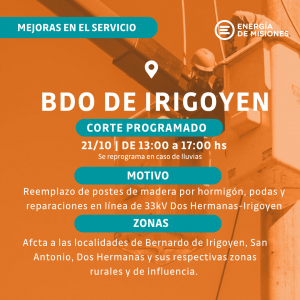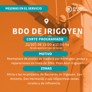 Este martes 21 de octubre, las cuadrillas técnicas de Energía de Misiones avanzarán con el recambio de postes de madera por columnas de hormigón, podas, despeje de traza y reparaciones varias que requerirán el corte de suministro entre las 13 y las 17, afectando a las localidades de Dos Hermanas, Bernardo de Irigoyen y San Antonio.