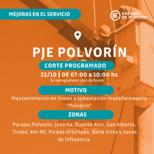 El miércoles 22, de 7 a 10 de la mañana, las cuadrillas trabajarán sobre la línea de 13,2Kv que alimenta la Subestación Transformadora del Paraje Polvorín, por lo que en ese horario quedarán sin suministro Polvorín y los parajes Juanita, Puente Alto, San Alberto, Timbó, Km 90, Picada Ortellado y Bella Vista.